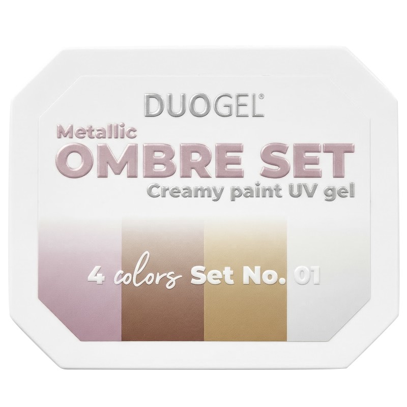 The NEW DUOgel Metallic kit is the ultimate solution for stunning nail art. It features 4 highly pigmented gels with a metallic finish, designed for creating flawless ombre gradients and intricate nail designs.