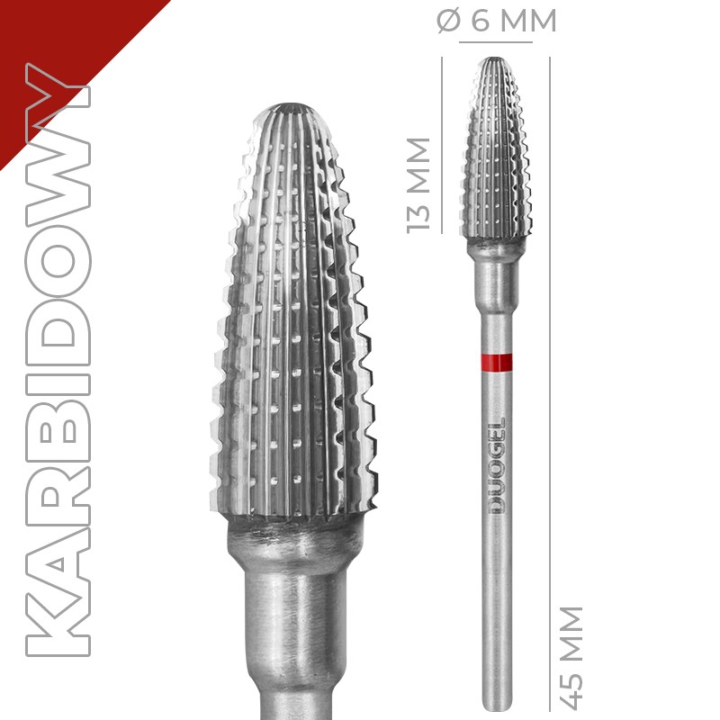 Fresa in carburo Cono arrotondato Ø6 mm con striscia rossa, in carburo sinterizzato per rimuovere gel, acrilico e masse ibride e per preparare le cuticole, ideale come taglierina per manicure e pedicure.