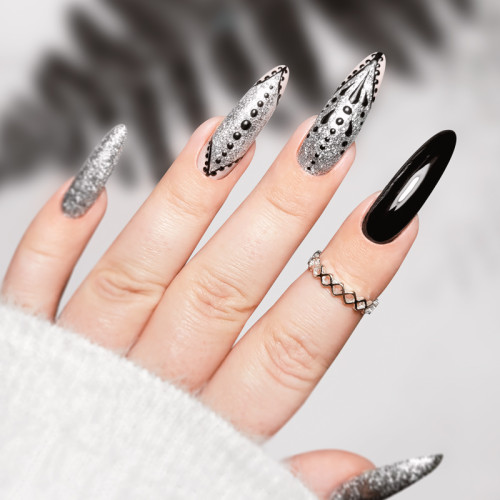 W przypadku rozbudowanych wzorów utwardź pojedyncze fragmenty zdobienia. Całość pokryj topem hybrydowym i utwardź.Czas utwardzania w lampie: UV 120 sek., LED 30-60 sek., lampa LED min 36W.