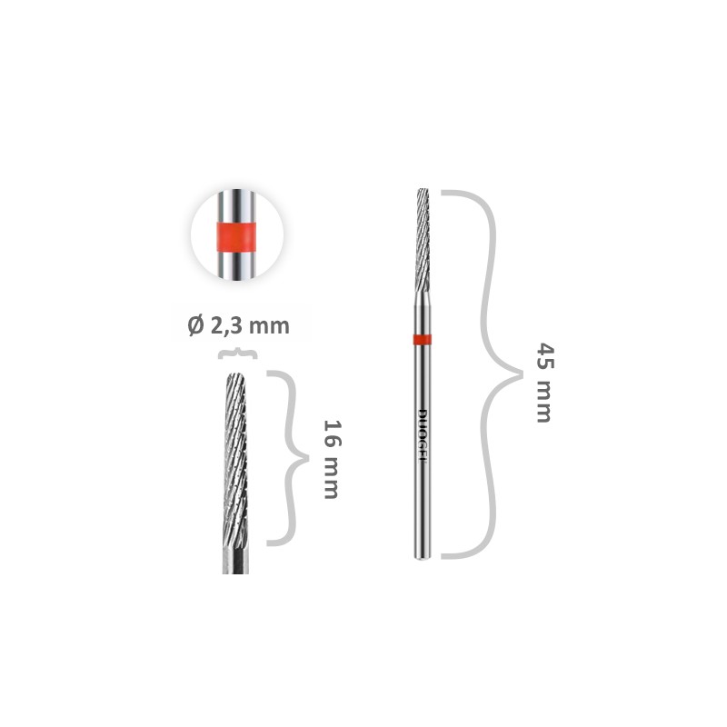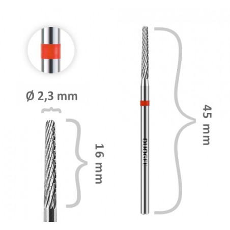 Frez KARBIDOWY Walec Ø 2,3 mm KR-WL-Fi23R-F44 z czerwonym paskiem, z węglika spiekanego sprawdzi się idealnie przy opracowywaniu paznokci przedłużanych za pomocą Dual Form, czy korekcie paznokci krogulczych. Dzięki niemu z łatwością podpiłujesz masę od spodu paznokcia.